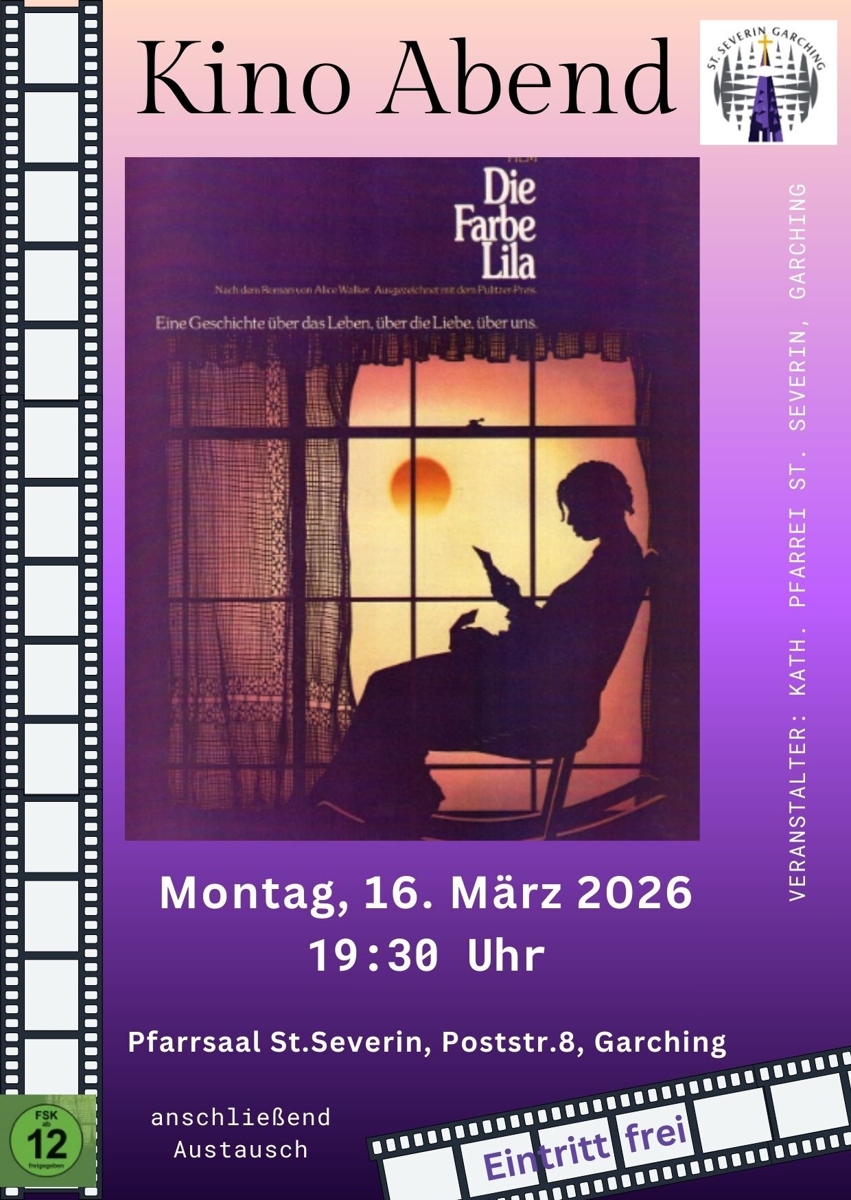 Kino Abend im Pfarrsaal. Gemeinsam schöne Filmerlebnisse genießen. Mit der Möglichkeit zum anschließenden Austausch.