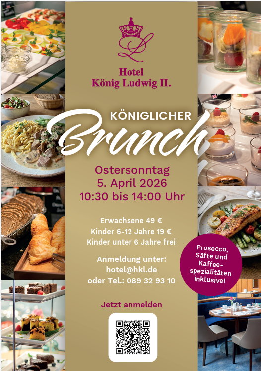 KÖNIGLICHER OSTERBRUNCHDatum: Ostersonntag, 5. April 2026Uhrzeit: 10:30 – 14:00 UhrOrt: Hotel König Ludwig II.Inklusive:ProseccoSäfteKaffeespezialitätenPreise:Erwachsene: 49 €Kinder (6–12 Jahre): 19 €Kinder unter 6 Jahre: freiReservierung:E-Mail: : 089 32 93 10👉 Jetzt anmelden & Plätze sichern!